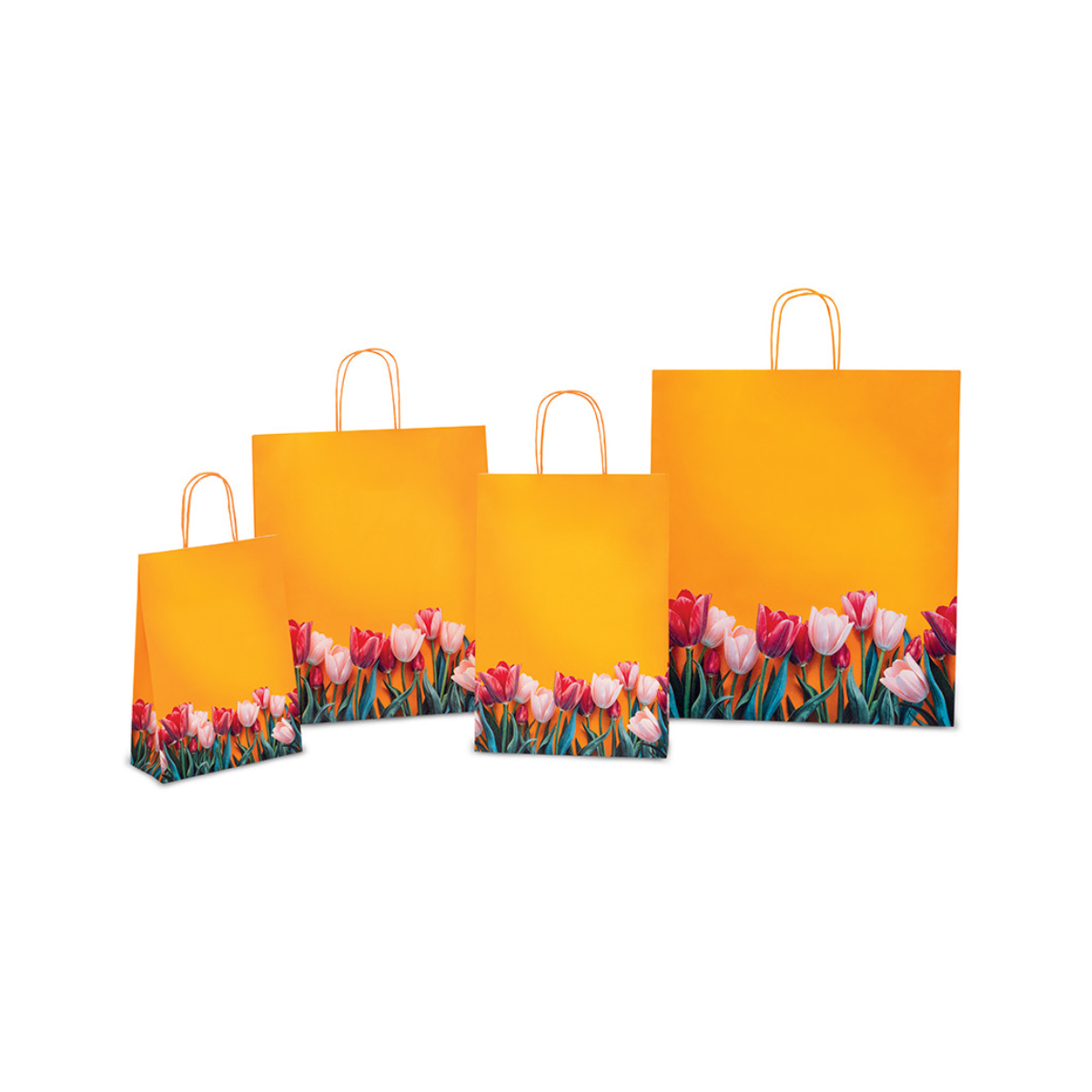 Busta shopper in carta Tulips con fantasia primaverile. Sacchetti in carta arancio con cordino ritorto.