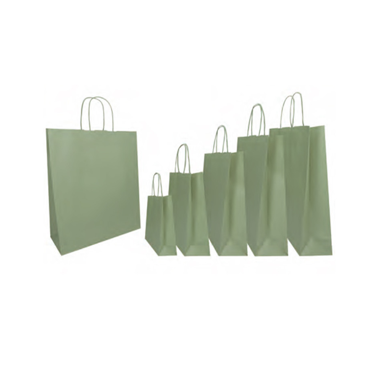 Buste shopper in carta colorata verde salvia con interno bianco, fondo pieno e con maniglia ritorta colorata, in tinta al sacchetto. Colori tenui in linea con i colori autunnali. Carta 100% riciclata.